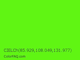 CIELCh 85.929,108.049,131.977 Color is a normal green color and the nearest color is Bright Green #66ff00. Hex code #60f515 and RGB value is rgb(96,245,21). In RGB color space, this color is composed of 38% red, 96% green, 8% blue, In CMYK color space, this color is composed of 61% cyan, 0% magenta, 91% yellow , 4% black , In HSL color space, this color has a hue angle of 100° , 92% saturation and 52% lightness.