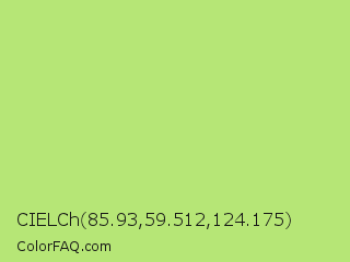 CIELCh 85.93,59.512,124.175 Color is a light green color and the nearest color is Sulu #c1f07c. Hex code #b6e676 and RGB value is rgb(182,230,118). In RGB color space, this color is composed of 71% red, 90% green, 46% blue, In CMYK color space, this color is composed of 21% cyan, 0% magenta, 49% yellow , 10% black , In HSL color space, this color has a hue angle of 86° , 69% saturation and 68% lightness.
