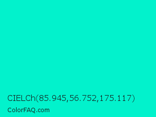CIELCh 85.945,56.752,175.117 Color is a normal cyan color and the nearest color is Bright Turquoise #08e8de. Hex code #02f2cc and RGB value is rgb(2,242,204). In RGB color space, this color is composed of 1% red, 95% green, 80% blue, In CMYK color space, this color is composed of 99% cyan, 0% magenta, 16% yellow , 5% black , In HSL color space, this color has a hue angle of 171° , 98% saturation and 48% lightness.