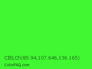 CIELCh 85.94,107.646,136.165 Color is a normal green color and the nearest color is Neon Green #39ff14. Hex code #41f731 and RGB value is rgb(65,247,49). In RGB color space, this color is composed of 25% red, 97% green, 19% blue, In CMYK color space, this color is composed of 74% cyan, 0% magenta, 80% yellow , 3% black , In HSL color space, this color has a hue angle of 115° , 93% saturation and 58% lightness.