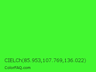 CIELCh 85.953,107.769,136.022 Color is a normal green color and the nearest color is Neon Green #39ff14. Hex code #42f730 and RGB value is rgb(66,247,48). In RGB color space, this color is composed of 26% red, 97% green, 19% blue, In CMYK color space, this color is composed of 73% cyan, 0% magenta, 81% yellow , 3% black , In HSL color space, this color has a hue angle of 115° , 93% saturation and 58% lightness.