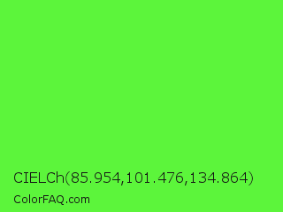 CIELCh 85.954,101.476,134.864 Color is a normal green color and the nearest color is Screamin Green #66ff66. Hex code #5cf53b and RGB value is rgb(92,245,59). In RGB color space, this color is composed of 36% red, 96% green, 23% blue, In CMYK color space, this color is composed of 62% cyan, 0% magenta, 76% yellow , 4% black , In HSL color space, this color has a hue angle of 109° , 90% saturation and 60% lightness.
