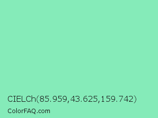 CIELCh 85.959,43.625,159.742 Color is a light green color and the nearest color is Algae Green #93dfb8. Hex code #85ebb9 and RGB value is rgb(133,235,185). In RGB color space, this color is composed of 52% red, 92% green, 73% blue, In CMYK color space, this color is composed of 43% cyan, 0% magenta, 21% yellow , 8% black , In HSL color space, this color has a hue angle of 151° , 72% saturation and 72% lightness.