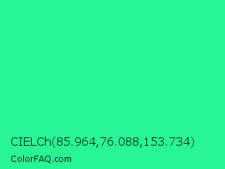 CIELCh 85.964,76.088,153.734 Color is a normal green color and the nearest color is Medium Spring Green #00fa9a. Hex code #29f594 and RGB value is rgb(41,245,148). In RGB color space, this color is composed of 16% red, 96% green, 58% blue, In CMYK color space, this color is composed of 83% cyan, 0% magenta, 40% yellow , 4% black , In HSL color space, this color has a hue angle of 151° , 91% saturation and 56% lightness.
