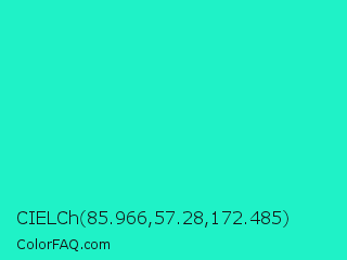 CIELCh 85.966,57.28,172.485 Color is a normal cyan color and the nearest color is Turquoise PWG #30d5c8. Hex code #1ff2c7 and RGB value is rgb(31,242,199). In RGB color space, this color is composed of 12% red, 95% green, 78% blue, In CMYK color space, this color is composed of 87% cyan, 0% magenta, 18% yellow , 5% black , In HSL color space, this color has a hue angle of 168° , 89% saturation and 54% lightness.