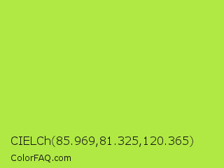 CIELCh 85.969,81.325,120.365 Color is a normal green color and the nearest color is Conifer #acdd4d. Hex code #b0e944 and RGB value is rgb(176,233,68). In RGB color space, this color is composed of 69% red, 91% green, 27% blue, In CMYK color space, this color is composed of 24% cyan, 0% magenta, 71% yellow , 9% black , In HSL color space, this color has a hue angle of 81° , 79% saturation and 59% lightness.