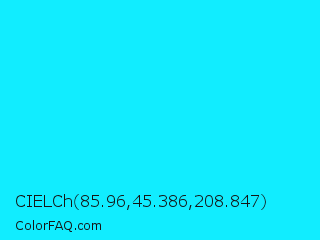 CIELCh 85.96,45.386,208.847 Color is a normal cyan color and the nearest color is Loeen #15f2fd. Hex code #11edff and RGB value is rgb(17,237,255). In RGB color space, this color is composed of 7% red, 93% green, 100% blue, In CMYK color space, this color is composed of 93% cyan, 7% magenta, 0% yellow , 0% black , In HSL color space, this color has a hue angle of 185° , 100% saturation and 53% lightness.