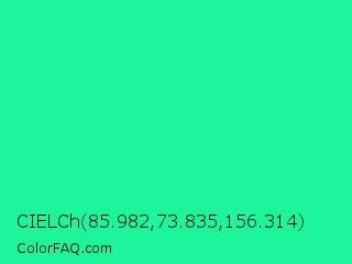 CIELCh 85.982,73.835,156.314 Color is a normal green color and the nearest color is Medium Spring Green #00fa9a. Hex code #1cf59c and RGB value is rgb(28,245,156). In RGB color space, this color is composed of 11% red, 96% green, 61% blue, In CMYK color space, this color is composed of 89% cyan, 0% magenta, 36% yellow , 4% black , In HSL color space, this color has a hue angle of 155° , 92% saturation and 54% lightness.