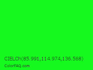 CIELCh 85.991,114.974,136.568 Color is a normal green color and the nearest color is Green #00ff00. Hex code #13f91b and RGB value is rgb(19,249,27). In RGB color space, this color is composed of 7% red, 98% green, 11% blue, In CMYK color space, this color is composed of 92% cyan, 0% magenta, 89% yellow , 2% black , In HSL color space, this color has a hue angle of 122° , 95% saturation and 53% lightness.