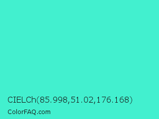 CIELCh 85.998,51.02,176.168 Color is a normal cyan color and the nearest color is Turquoise #40e0d0. Hex code #42f0cf and RGB value is rgb(66,240,207). In RGB color space, this color is composed of 26% red, 94% green, 81% blue, In CMYK color space, this color is composed of 73% cyan, 0% magenta, 14% yellow , 6% black , In HSL color space, this color has a hue angle of 169° , 85% saturation and 60% lightness.