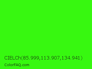 CIELCh 85.999,113.907,134.941 Color is a normal green color and the nearest color is Neon Green #39ff14. Hex code #37f810 and RGB value is rgb(55,248,16). In RGB color space, this color is composed of 22% red, 97% green, 6% blue, In CMYK color space, this color is composed of 78% cyan, 0% magenta, 94% yellow , 3% black , In HSL color space, this color has a hue angle of 110° , 94% saturation and 52% lightness.
