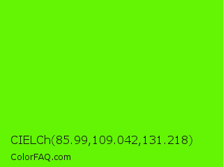 CIELCh 85.99,109.042,131.218 Color is a normal green color and the nearest color is Bright Green #66ff00. Hex code #63f504 and RGB value is rgb(99,245,4). In RGB color space, this color is composed of 39% red, 96% green, 2% blue, In CMYK color space, this color is composed of 60% cyan, 0% magenta, 98% yellow , 4% black , In HSL color space, this color has a hue angle of 96° , 97% saturation and 49% lightness.