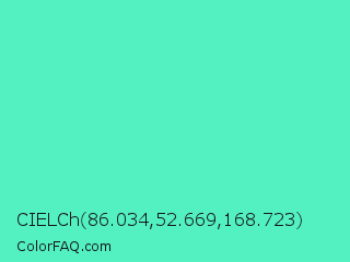 CIELCh 86.034,52.669,168.723 Color is a light green color and the nearest color is Turquoise #40e0d0. Hex code #53f0c2 and RGB value is rgb(83,240,194). In RGB color space, this color is composed of 33% red, 94% green, 76% blue, In CMYK color space, this color is composed of 65% cyan, 0% magenta, 19% yellow , 6% black , In HSL color space, this color has a hue angle of 162° , 84% saturation and 63% lightness.