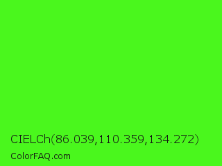 CIELCh 86.039,110.359,134.272 Color is a normal green color and the nearest color is Neon Green #39ff14. Hex code #4af71d and RGB value is rgb(74,247,29). In RGB color space, this color is composed of 29% red, 97% green, 11% blue, In CMYK color space, this color is composed of 70% cyan, 0% magenta, 88% yellow , 3% black , In HSL color space, this color has a hue angle of 108° , 93% saturation and 54% lightness.
