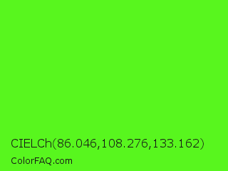 CIELCh 86.046,108.276,133.162 Color is a normal green color and the nearest color is Neon Green #39ff14. Hex code #58f61e and RGB value is rgb(88,246,30). In RGB color space, this color is composed of 35% red, 96% green, 12% blue, In CMYK color space, this color is composed of 64% cyan, 0% magenta, 88% yellow , 4% black , In HSL color space, this color has a hue angle of 104° , 92% saturation and 54% lightness.