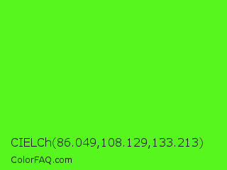 CIELCh 86.049,108.129,133.213 Color is a normal green color and the nearest color is Neon Green #39ff14. Hex code #58f61f and RGB value is rgb(88,246,31). In RGB color space, this color is composed of 35% red, 96% green, 12% blue, In CMYK color space, this color is composed of 64% cyan, 0% magenta, 87% yellow , 4% black , In HSL color space, this color has a hue angle of 104° , 92% saturation and 54% lightness.