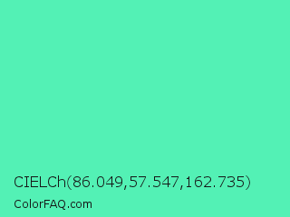 CIELCh 86.049,57.547,162.735 Color is a light green color and the nearest color is Medium Aquamarine #66ddaa. Hex code #53f1b5 and RGB value is rgb(83,241,181). In RGB color space, this color is composed of 33% red, 95% green, 71% blue, In CMYK color space, this color is composed of 66% cyan, 0% magenta, 25% yellow , 5% black , In HSL color space, this color has a hue angle of 157° , 85% saturation and 64% lightness.