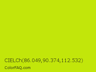 CIELCh 86.049,90.374,112.532 Color is a normal yellow color and the nearest color is Las Palmas #c6e610. Hex code #c2e60a and RGB value is rgb(194,230,10). In RGB color space, this color is composed of 76% red, 90% green, 4% blue, In CMYK color space, this color is composed of 16% cyan, 0% magenta, 96% yellow , 10% black , In HSL color space, this color has a hue angle of 70° , 92% saturation and 47% lightness.