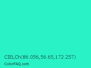 CIELCh 86.056,56.65,172.257 Color is a normal cyan color and the nearest color is Turquoise PWG #30d5c8. Hex code #29f2c7 and RGB value is rgb(41,242,199). In RGB color space, this color is composed of 16% red, 95% green, 78% blue, In CMYK color space, this color is composed of 83% cyan, 0% magenta, 18% yellow , 5% black , In HSL color space, this color has a hue angle of 167° , 89% saturation and 55% lightness.
