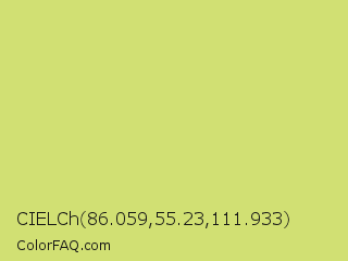 CIELCh 86.059,55.23,111.933 Color is a light yellow color and the nearest color is Yellow Green #c5e17a. Hex code #d1e073 and RGB value is rgb(209,224,115). In RGB color space, this color is composed of 82% red, 88% green, 45% blue, In CMYK color space, this color is composed of 7% cyan, 0% magenta, 49% yellow , 12% black , In HSL color space, this color has a hue angle of 68° , 64% saturation and 66% lightness.