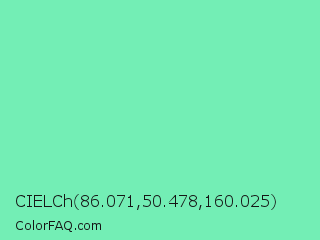 CIELCh 86.071,50.478,160.025 Color is a light green color and the nearest color is Medium Aquamarine #66ddaa. Hex code #73eeb5 and RGB value is rgb(115,238,181). In RGB color space, this color is composed of 45% red, 93% green, 71% blue, In CMYK color space, this color is composed of 52% cyan, 0% magenta, 24% yellow , 7% black , In HSL color space, this color has a hue angle of 152° , 78% saturation and 69% lightness.