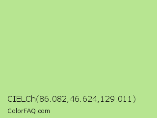 CIELCh 86.082,46.624,129.011 Color is a light green color and the nearest color is Granny Smith Apple #a8e4a0. Hex code #b7e591 and RGB value is rgb(183,229,145). In RGB color space, this color is composed of 72% red, 90% green, 57% blue, In CMYK color space, this color is composed of 20% cyan, 0% magenta, 37% yellow , 10% black , In HSL color space, this color has a hue angle of 93° , 62% saturation and 73% lightness.