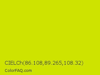 CIELCh 86.108,89.265,108.32 Color is a normal yellow color and the nearest color is Bitter Lemon #cae00d. Hex code #cfe300 and RGB value is rgb(207,227,0). In RGB color space, this color is composed of 81% red, 89% green, 0% blue, In CMYK color space, this color is composed of 9% cyan, 0% magenta, 100% yellow , 11% black , In HSL color space, this color has a hue angle of 65° , 100% saturation and 45% lightness.