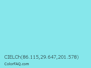 CIELCh 86.115,29.647,201.578 Color is a light cyan color and the nearest color is Medium Sky Blue #80daeb. Hex code #86e7eb and RGB value is rgb(134,231,235). In RGB color space, this color is composed of 53% red, 91% green, 92% blue, In CMYK color space, this color is composed of 43% cyan, 2% magenta, 0% yellow , 8% black , In HSL color space, this color has a hue angle of 182° , 72% saturation and 72% lightness.