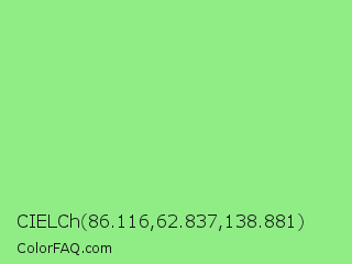 CIELCh 86.116,62.837,138.881 Color is a light green color and the nearest color is Light Green #90ee90. Hex code #90ed86 and RGB value is rgb(144,237,134). In RGB color space, this color is composed of 56% red, 93% green, 53% blue, In CMYK color space, this color is composed of 39% cyan, 0% magenta, 43% yellow , 7% black , In HSL color space, this color has a hue angle of 114° , 74% saturation and 73% lightness.