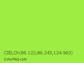 CIELCh 86.122,86.245,124.963 Color is a normal green color and the nearest color is Kiwi #8ee53f. Hex code #9eed42 and RGB value is rgb(158,237,66). In RGB color space, this color is composed of 62% red, 93% green, 26% blue, In CMYK color space, this color is composed of 33% cyan, 0% magenta, 72% yellow , 7% black , In HSL color space, this color has a hue angle of 88° , 83% saturation and 59% lightness.