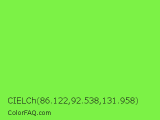 CIELCh 86.122,92.538,131.958 Color is a light green color and the nearest color is Kiwi #8ee53f. Hex code #7cf246 and RGB value is rgb(124,242,70). In RGB color space, this color is composed of 49% red, 95% green, 27% blue, In CMYK color space, this color is composed of 49% cyan, 0% magenta, 71% yellow , 5% black , In HSL color space, this color has a hue angle of 101° , 87% saturation and 61% lightness.