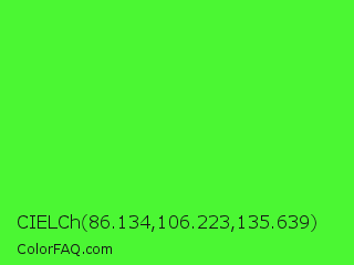 CIELCh 86.134,106.223,135.639 Color is a normal green color and the nearest color is Neon Green #39ff14. Hex code #4bf733 and RGB value is rgb(75,247,51). In RGB color space, this color is composed of 29% red, 97% green, 20% blue, In CMYK color space, this color is composed of 70% cyan, 0% magenta, 79% yellow , 3% black , In HSL color space, this color has a hue angle of 113° , 92% saturation and 58% lightness.