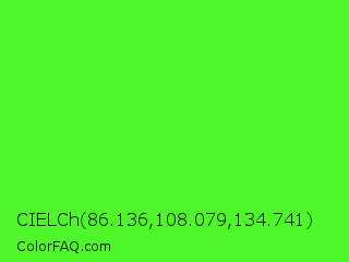 CIELCh 86.136,108.079,134.741 Color is a normal green color and the nearest color is Neon Green #39ff14. Hex code #4df729 and RGB value is rgb(77,247,41). In RGB color space, this color is composed of 30% red, 97% green, 16% blue, In CMYK color space, this color is composed of 69% cyan, 0% magenta, 83% yellow , 3% black , In HSL color space, this color has a hue angle of 110° , 93% saturation and 56% lightness.