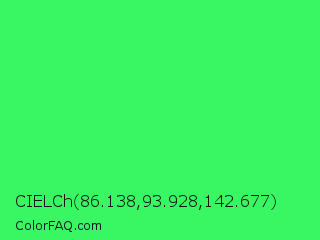 CIELCh 86.138,93.928,142.677 Color is a normal green color and the nearest color is UFO Green #3cd070. Hex code #38f763 and RGB value is rgb(56,247,99). In RGB color space, this color is composed of 22% red, 97% green, 39% blue, In CMYK color space, this color is composed of 77% cyan, 0% magenta, 60% yellow , 3% black , In HSL color space, this color has a hue angle of 134° , 92% saturation and 59% lightness.