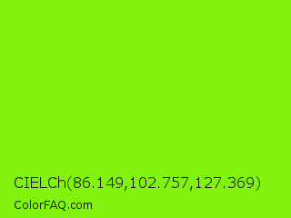CIELCh 86.149,102.757,127.369 Color is a normal green color and the nearest color is Lawn Green #7cfc00. Hex code #82f20f and RGB value is rgb(130,242,15). In RGB color space, this color is composed of 51% red, 95% green, 6% blue, In CMYK color space, this color is composed of 46% cyan, 0% magenta, 94% yellow , 5% black , In HSL color space, this color has a hue angle of 90° , 90% saturation and 50% lightness.