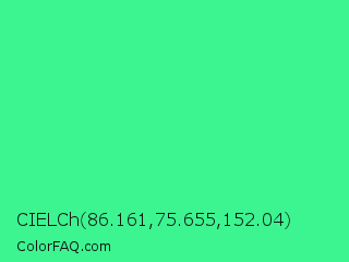 CIELCh 86.161,75.655,152.04 Color is a normal green color and the nearest color is Eucalyptus #44d7a8. Hex code #3cf591 and RGB value is rgb(60,245,145). In RGB color space, this color is composed of 24% red, 96% green, 57% blue, In CMYK color space, this color is composed of 76% cyan, 0% magenta, 41% yellow , 4% black , In HSL color space, this color has a hue angle of 148° , 90% saturation and 60% lightness.
