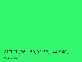 CIELCh 86.169,90.53,144.848 Color is a normal green color and the nearest color is UFO Green #3cd070. Hex code #32f76e and RGB value is rgb(50,247,110). In RGB color space, this color is composed of 20% red, 97% green, 43% blue, In CMYK color space, this color is composed of 80% cyan, 0% magenta, 55% yellow , 3% black , In HSL color space, this color has a hue angle of 138° , 92% saturation and 58% lightness.