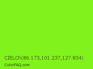 CIELCh 86.173,101.237,127.834 Color is a normal green color and the nearest color is Spring Frost #87ff2a. Hex code #82f21c and RGB value is rgb(130,242,28). In RGB color space, this color is composed of 51% red, 95% green, 11% blue, In CMYK color space, this color is composed of 46% cyan, 0% magenta, 88% yellow , 5% black , In HSL color space, this color has a hue angle of 91° , 89% saturation and 53% lightness.