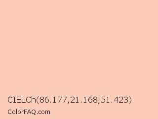 CIELCh 86.177,21.168,51.423 Color is a very light orange color and the nearest color is Romantic #ffd2b7. Hex code #fcceb9 and RGB value is rgb(252,206,185). In RGB color space, this color is composed of 99% red, 81% green, 73% blue, In CMYK color space, this color is composed of 0% cyan, 18% magenta, 27% yellow , 1% black , In HSL color space, this color has a hue angle of 19° , 92% saturation and 86% lightness.