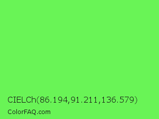 CIELCh 86.194,91.211,136.579 Color is a light green color and the nearest color is Screamin Green #66ff66. Hex code #69f456 and RGB value is rgb(105,244,86). In RGB color space, this color is composed of 41% red, 96% green, 34% blue, In CMYK color space, this color is composed of 57% cyan, 0% magenta, 65% yellow , 4% black , In HSL color space, this color has a hue angle of 113° , 88% saturation and 65% lightness.