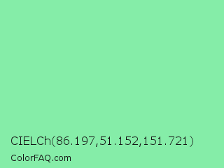 CIELCh 86.197,51.152,151.721 Color is a light green color and the nearest color is Teal Deer #99e6b3. Hex code #85eda8 and RGB value is rgb(133,237,168). In RGB color space, this color is composed of 52% red, 93% green, 66% blue, In CMYK color space, this color is composed of 44% cyan, 0% magenta, 29% yellow , 7% black , In HSL color space, this color has a hue angle of 140° , 74% saturation and 73% lightness.