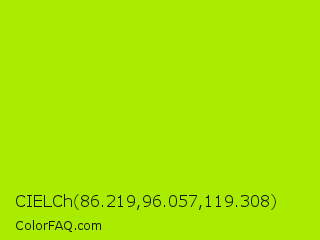 CIELCh 86.219,96.057,119.308 Color is a normal lime color and the nearest color is Spring Bud #a7fc00. Hex code #a9ec00 and RGB value is rgb(169,236,0). In RGB color space, this color is composed of 66% red, 93% green, 0% blue, In CMYK color space, this color is composed of 28% cyan, 0% magenta, 100% yellow , 7% black , In HSL color space, this color has a hue angle of 77° , 100% saturation and 46% lightness.