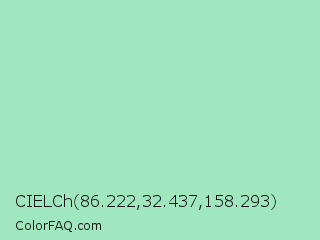 CIELCh 86.222,32.437,158.293 Color is a light green color and the nearest color is Sea Foam Green #9fe2bf. Hex code #a0e7c0 and RGB value is rgb(160,231,192). In RGB color space, this color is composed of 63% red, 91% green, 75% blue, In CMYK color space, this color is composed of 31% cyan, 0% magenta, 17% yellow , 9% black , In HSL color space, this color has a hue angle of 147° , 60% saturation and 77% lightness.
