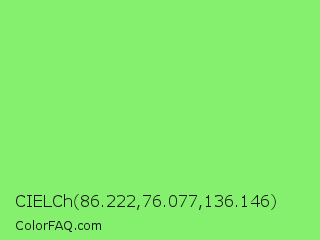 CIELCh 86.222,76.077,136.146 Color is a light green color and the nearest color is Pastel Green #77dd77. Hex code #85f06e and RGB value is rgb(133,240,110). In RGB color space, this color is composed of 52% red, 94% green, 43% blue, In CMYK color space, this color is composed of 45% cyan, 0% magenta, 54% yellow , 6% black , In HSL color space, this color has a hue angle of 109° , 81% saturation and 69% lightness.