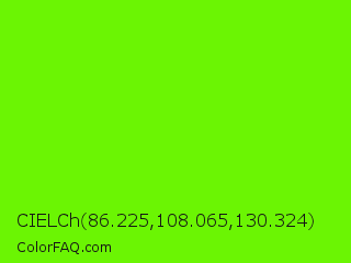 CIELCh 86.225,108.065,130.324 Color is a normal green color and the nearest color is Bright Green #66ff00. Hex code #6bf503 and RGB value is rgb(107,245,3). In RGB color space, this color is composed of 42% red, 96% green, 1% blue, In CMYK color space, this color is composed of 56% cyan, 0% magenta, 99% yellow , 4% black , In HSL color space, this color has a hue angle of 94° , 98% saturation and 49% lightness.