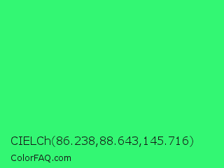 CIELCh 86.238,88.643,145.716 Color is a normal green color and the nearest color is UFO Green #3cd070. Hex code #33f773 and RGB value is rgb(51,247,115). In RGB color space, this color is composed of 20% red, 97% green, 45% blue, In CMYK color space, this color is composed of 79% cyan, 0% magenta, 53% yellow , 3% black , In HSL color space, this color has a hue angle of 140° , 92% saturation and 58% lightness.