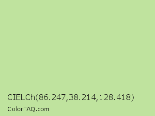 CIELCh 86.247,38.214,128.418 Color is a light green color and the nearest color is Sprout #c1d7b0. Hex code #bfe39e and RGB value is rgb(191,227,158). In RGB color space, this color is composed of 75% red, 89% green, 62% blue, In CMYK color space, this color is composed of 16% cyan, 0% magenta, 30% yellow , 11% black , In HSL color space, this color has a hue angle of 91° , 55% saturation and 75% lightness.