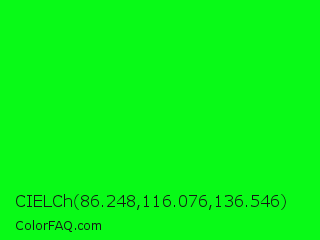CIELCh 86.248,116.076,136.546 Color is a normal green color and the nearest color is Green #00ff00. Hex code #08fa17 and RGB value is rgb(8,250,23). In RGB color space, this color is composed of 3% red, 98% green, 9% blue, In CMYK color space, this color is composed of 97% cyan, 0% magenta, 91% yellow , 2% black , In HSL color space, this color has a hue angle of 124° , 96% saturation and 51% lightness.