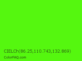 CIELCh 86.25,110.743,132.869 Color is a normal green color and the nearest color is Chlorophyll Green #4aff00. Hex code #55f70f and RGB value is rgb(85,247,15). In RGB color space, this color is composed of 33% red, 97% green, 6% blue, In CMYK color space, this color is composed of 66% cyan, 0% magenta, 94% yellow , 3% black , In HSL color space, this color has a hue angle of 102° , 94% saturation and 51% lightness.