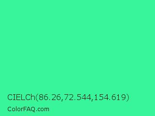 CIELCh 86.26,72.544,154.619 Color is a normal green color and the nearest color is Eucalyptus #44d7a8. Hex code #39f59a and RGB value is rgb(57,245,154). In RGB color space, this color is composed of 22% red, 96% green, 60% blue, In CMYK color space, this color is composed of 77% cyan, 0% magenta, 37% yellow , 4% black , In HSL color space, this color has a hue angle of 151° , 90% saturation and 59% lightness.